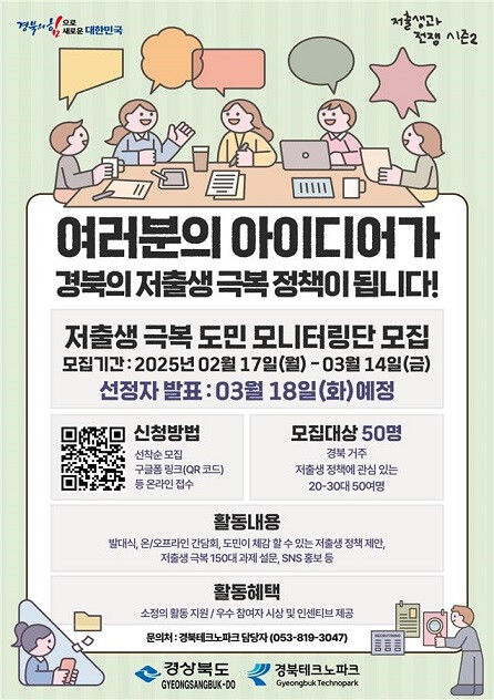17일 경북도는 저출생 극복 도민 모니터링단을 모집한다고 밝혔다. 이는 정책 수요자인 도민의 목소리를 적극 수렴하고 3,600억 원의 예산이 투입된 저출생 사업을 도민의 시선에서 평가하기 위한 것이다.