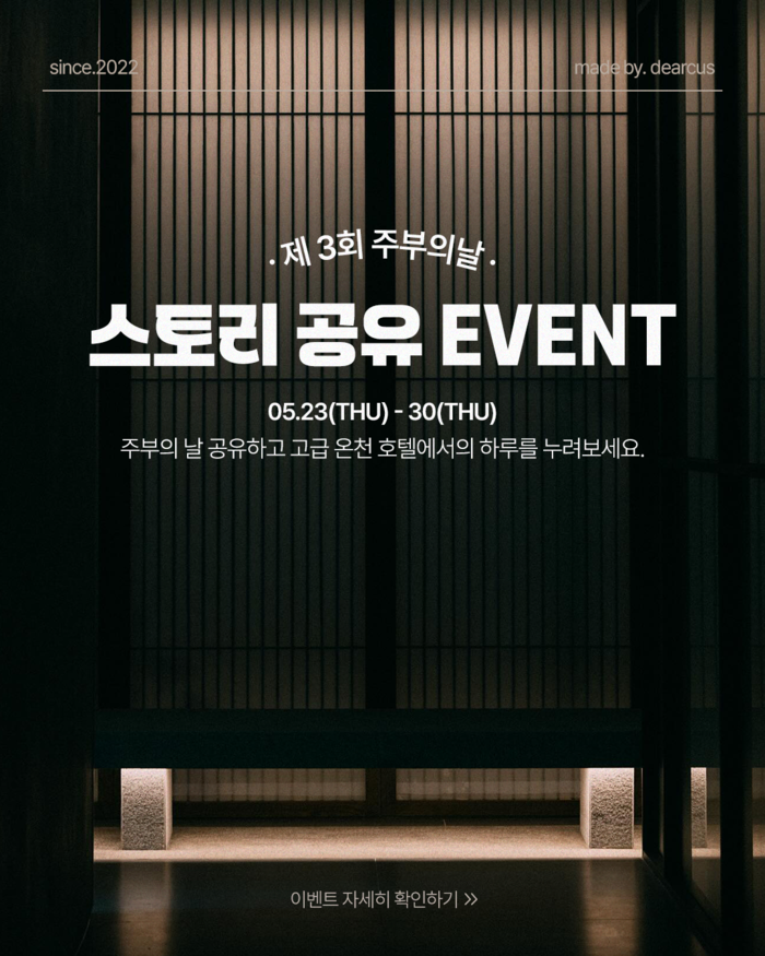 올해로 3회를 맞이한 주부의날 기념 이벤트 당첨자 1등에게는 수안보 명품 온천 호텔 '유원재' 1박 숙박권, 2등은 디어커스 살림 도우미 (싱크대 물막이 / 도돌이 찌든때 클리너 / 소탈한 소독 탈취제 / 숯한날 주방세제 / 원데이 수세미 / 원데이 수세미 엠보싱) 제품, 그리고 3등에게는 디어커스 그레이 원데이 수세미가 증정된다.