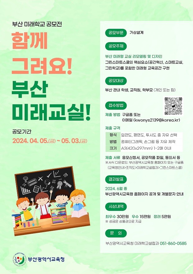 부산교육청은 ‘부산 미래형 교실 리모델링 및 디자인’을 주제로 공모전을 진행한다. 공간혁신·스마트 교실·그린 학교 등 그린스마트스쿨의 핵심 요소를 포함한 미래형 교육 공간을 가상 설계하는 방식이다.