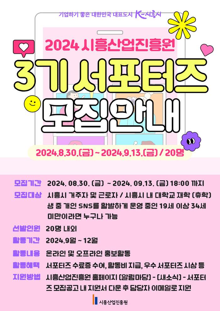 한편, 서포터즈 모집은 오는 9월 13일까지이며, 제출된 지원서를 바탕으로 20명 내외 인원을 선발할 예정이다. 자세한 내용은 시흥산업진흥원 홈페이지에서 확인할 수 있다.