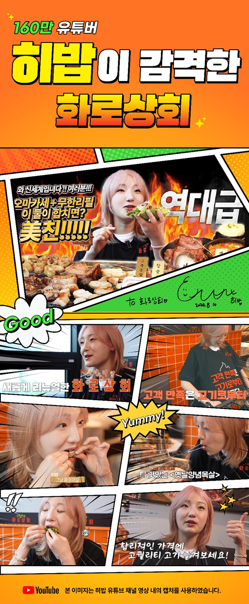 화로상회 관계자는 “인기 먹방 유튜버 히밥과 함께 콜라보 콘텐츠를 촬영하였으며 해당 영상은 유튜브 히밥 채널에 업로드됨과 동시에 큰 인기를 끌고 있다”라며 “먹방 크리에이터 히밥과 화로상회의 맛있는 고기와 건강한 샐러드&다양한 시즈닝을 고객분들께 선보이게 돼 기쁘다”고 전했다.