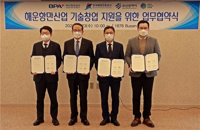 부산시(시장 박형준)는 오늘(23일) 오전 10시, 동구 초량동에 위치한 해운항만산업 기술창업 지원플랫폼(1876 Busan)에서 부산항만공사, 한국해양진흥공사, 코리아스타트업포럼과 「해운항만산업 기술창업 지원을 위한 업무협약」을 체결했다고 밝혔다.