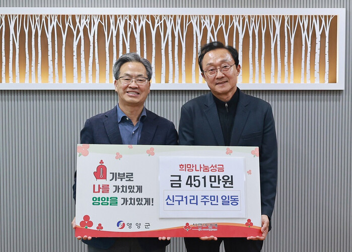 오도창 영양군수는 “마을 공동체의 힘을 발휘해 많은 이들에게 귀감이 되어주신 신구1리 정문섭 이장님과 주민분들께 진심으로 감사드린다.”라고 전하며, ‘이번 기부가 지역사회에 긍정적인 영향을 미칠 것’이라고 말했다.