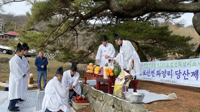 ‘합천 화양리 소나무’ 당산제는 우리 고유의 전통 미풍양속으로, 문화재청과 합천군이 자연유산 민속행사의 보존과 계승을 위해 매년 지원하고 있다. 화양리 소나무는 높이 17.7m, 둘레 6.15m의 크기로, 나이는 500년 정도로 추정된다.