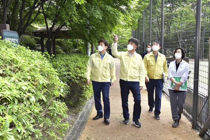 서울 중랑구가 이달 말까지 지역 다중이용시설 43곳에 대해 중대시민재해 예방을 위한 현장점검을 실시하고 있다. 체육관 등 시설들에 대해 안전 및 보건 확보 의무 이행 여부를 확인하고 시설 전반에 대한 육안점검을 진행한다. 사진은 최근 김태희 구청장 권한대행(왼쪽 두번째)이 관계자들과 돌산체육공원 절개지에서 현장점검을 실시하고 있는 모습. (사진제공=중랑구청)