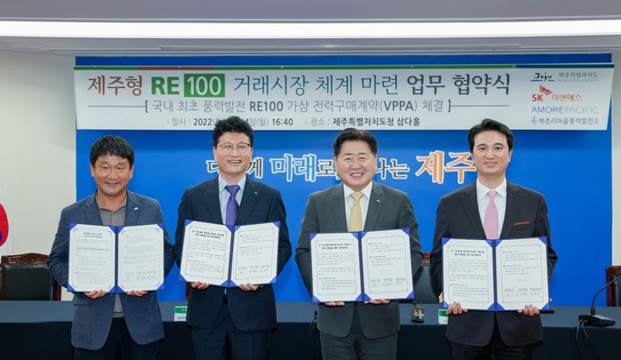 [시민일보 = 홍덕표 기자] 아모레퍼시픽이 제주 북촌리 마을 풍력인 (주)북촌서모풍력과 국내 최초의 가상전력구매계약(VPPA, Virtual Power Purchase Agreement)을 체결했다.