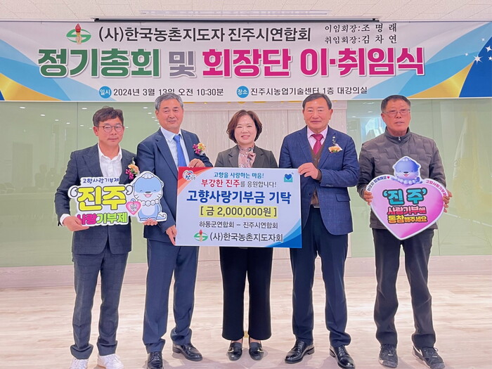이날 시 연합회 및 읍.면.동지회 임원 등 40여 명이 참석한 가운데 제25대 조명래 회장이 이임하고 제26대 김차연 회장이 신임회장으로 취임했다. 또한 농촌지도자 하동군연합회와의 고향사랑기부금 기탁식도 함께 진행됐다.