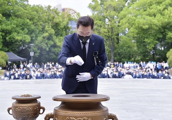 | 이용섭 광주광역시장이 6일 오전 남구 광주공원 현충탑에서 열린 '제67회 현충일 추념식'에 참석해 헌화와 분향을 하고 있다./광주광역시 제공 |