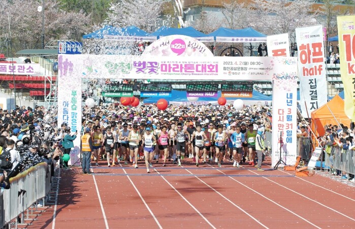 합천군이 주최하고 합천군체육회가 주관한 제22회 합천 벚꽃마라톤대회는 대한육상연맹 공인코스로 수려한 황강변을 배경으로 100리 벚꽃길을 따라 흩날리는 벚꽃과 함께 풀코스, 하프코스, 10km, 5km 4종목을 달리는 명품 마라톤대회로 유명하다.