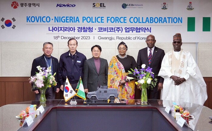이를 축하하는 기념식이 18일 오전 평동산단 코비코㈜ 대회의실에서 강기정 광주광역시장과 술레이만 이브라힘 아이만 나이지리아 경찰부장관, 압두야리 수아야우 라피아 나이지리아 경찰청 정보부 수장, 느온예 퍼디난드 주한 나이지리아 대사, 마지다디 발라 무아주 콘타고라 AGED NETWORK 대표, 김영우 산벨오데나 대표, 조광철 코비코㈜ 대표 등이 참석한 가운데 열렸다.