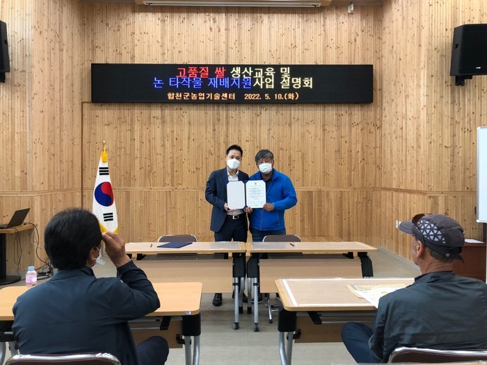 이번 교육 및 설명회는 밑비료의 적정 사용량, 키다리병 방제를 위한 종자소독 요령, 적기 이앙 및 수확으로 품질확보 등 합천군 실정에 맞는 재배교육을 진행했다. 또한, 쌀 소비의 지속적인 감소와 쌀 과잉 생산으로 쌀값이 하락할 것으로 우려되고 있어 합천군농업기술센터와 쌀전업농 합천군지회는 논 타작물 재배면적 확대 실천 협약을 체결했다.