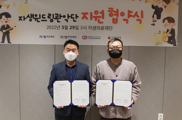 | ▲ 자생의료재단 고경석 사무총장(왼쪽)과 부천동종합사회복지관 권혁철 관장이 ‘자생 윈드림 관악단’ 협약식을 마친 후 기념 촬영을 하고 있다. (사진제공=자생한방병원) |
