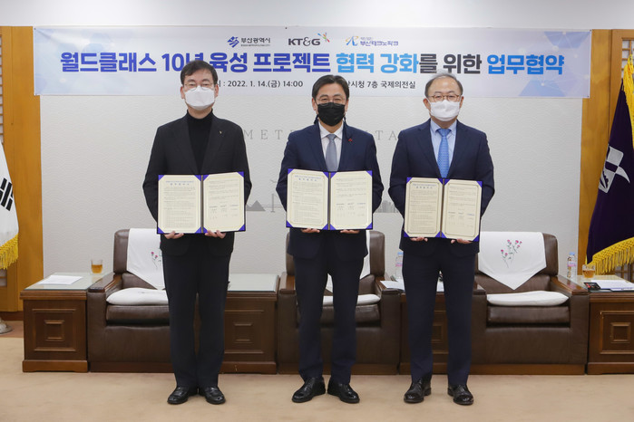 [시민일보 = 홍덕표 기자] KT&G가 부산광역시 (재)부산테크노파크와 '월드클래스 10년 프로젝트' 업무협약을 지난 14일 부산시청 국제의전실에서 체결했다.