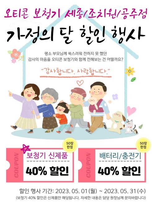 오티콘 보청기 세종/조치원 센터 관계자는 “가정의 달을 맞아 난청으로 일상생활에 불편함을 느끼는 부모님이나 의사소통이 어려운 가족때문에 고민하고 계신다면 가까운 저희 센터에 방문해 무료상담을 받아 보시고, 5월 한달 동안 진행되는 가정의 달 할인 이벤트 혜택도 꼭 받아 보시기를 바란다”고 전했다.