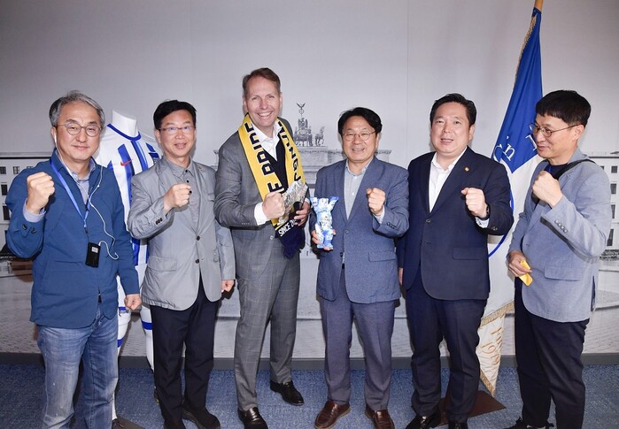 | ▲ 강기정 광주광역시장, 김병내 남구청장, 박병규 광산구청장 등 광주시대표단이 27일(현지시간) 오전 독일 베를린 축구클럽 '헤르타BSC'를 방문해 페어 모크-슈튀르머(Peer Mock-Stürmer) 헤르타BSC 의장단 위원과 스포츠 교육정책 등을 논의한 뒤 기념촬영을 하고 있다./광주광역시 제공 |