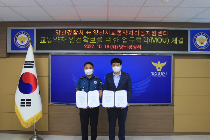 [양산=최성일 기자] 양산경찰서(서장 한상철)는 지난 18일 14:00 경찰서 2층 회의실에서 양산시 교통약자이동지원센터와 ‘교통약자 안전 확보를 위한 업무협약(MOU)’을 체결했다.