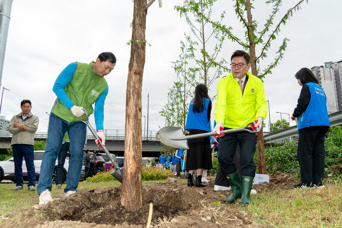 | ▲ 7일 메타세쿼이아길 조성 행사에서 나무심는 이필형 동대문구청장(오른쪽)과 정재훈 동아쏘시오홀딩스 대표(왼쪽) (사진=동대문구청 제공) |