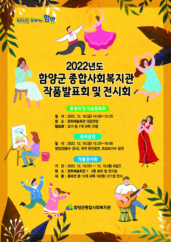 군 관계자는“코로나로 인해 3년 만에 개최하는 함양군 종합사회복지관 작품 발표회에 많은 군민들께서 참석하여 축하와 응원을 해 주시어 수강생과 군민들이 한해를 마무리 하는 화합의 장이 되길 바란다”고 전했다.
