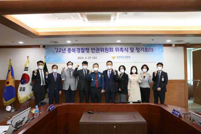 충북경찰청(청장 정용근)은 지난 27일 경찰 활동 전반에 대한 민주적 통제를 구현하고 경찰행정의 인권 지향성을 높이기 위해 2022년 충북경찰청 인권위원회 신규 위원 위촉식을 가졌다.