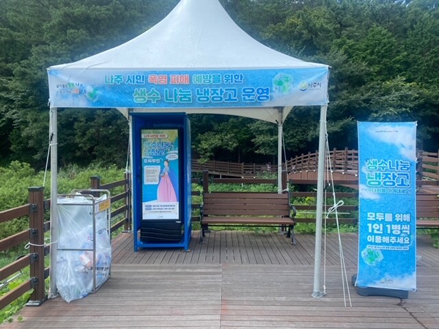 나주시는 무더운 여름철 시민들의 온열질환 발생 등 피해 예방을 위해 유동인구가 많은 산책로에 ‘생수 나눔 냉장고’를 설치했다고 16일 밝혔다.