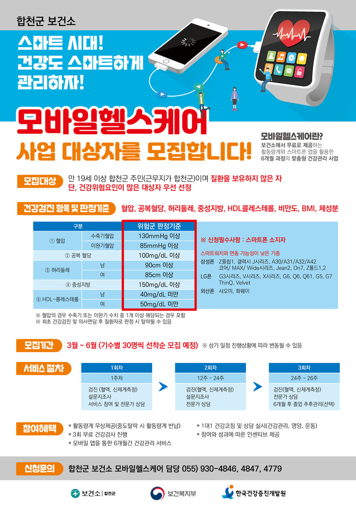 신청 자격은 스마트폰을 소지한 만 19세 이상 지역 내 거주자 및 직장인으로, 건강위험요인(혈압·공복혈당·허리둘레·중성지방·HDL콜레스테롤)을 1개 이상 가지고 있는 사람이다. 당뇨병, 고혈압, 고지혈증을 진단받았거나 치료를 위한 약물을 복용 중인 자는 제외된다.