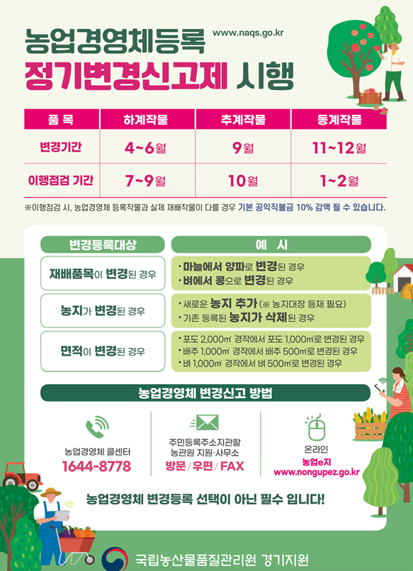 농업경영체 등록 농업인은 공익직불금 등 농업 관련 융자‧보조금 혜택을 받는 대신 재배품목·농지 등이 변경될 경우 반드시 농관원에 변경신고를 해야 하는 의무가 있다.