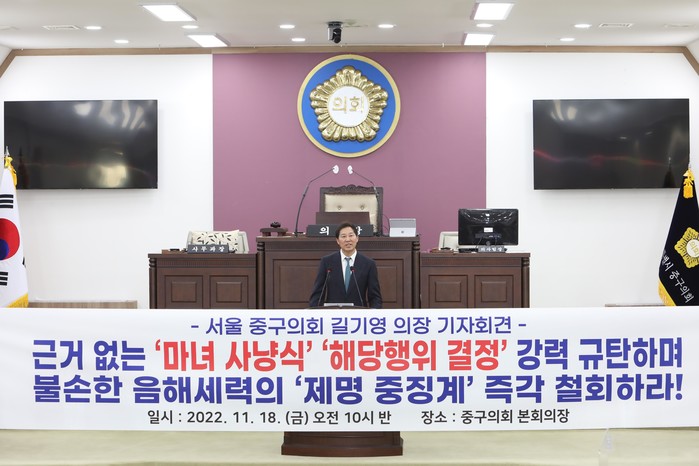 [시민일보 = 여영준 기자] 길기영 서울 중구의회 의장은 지난 18일 중구의회 본회의장에서 국민의힘 서울시당 윤리위원회가 ‘해당행위’ 사유로 내린 ‘제명’ 처분과 관련해 "제명 중징계 처분을 즉각 철회하라"고 밝혔다.
