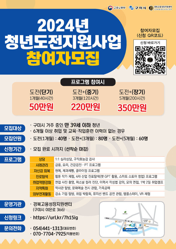 참여 대상은 18세 이상 39세 이하 청년 중 최근 6개월간 취업 및 교육, 직업훈련 참여 이력이 없는 구미시민이면 누구나 참여할 수 있다. 청년들에게 구직준비도 검사와 개별상담을 진행해 그 결과를 바탕으로 유형별(도전, 도전+중기, 도전+장기)로 맞춤형 프로그램을 제공할 예정이다. 프로그램 참여 수당과 이수‧취업 인센티브는 최대 350만 원까지 지원한다.
