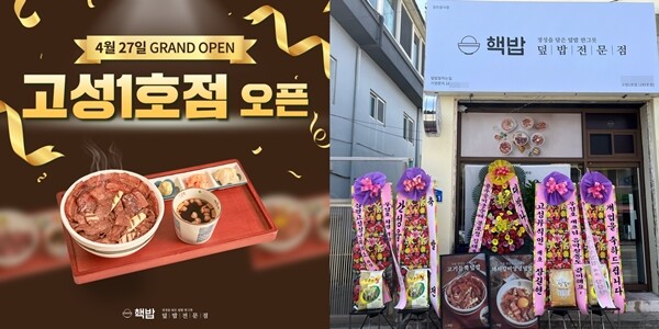 27일 오픈한 ‘핵밥 고성1호점’은 강원도 고성군 간성읍에 위치한 신규 매장이다. 간성터미널, 간성초등학교, 오피스 상가, 주택가 인근에 위치해 있어 터미널 이용객, 주민, 직장인, 가족 단위 고객들의 풍부한 수요가 예상된다는 게 업체 측 설명이다.