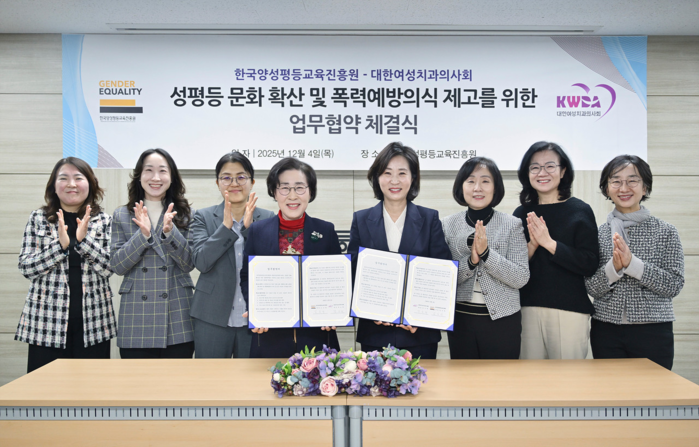 성평등가족부 산하 한국양성평등교육진흥원(원장 김삼화)은 대한여성치과의사회(회장 장소희)와 성평등 문화 및 폭력예방 의식 확산을 위한 상호 업무협약(MOU)을 12월 4일(목) 체결했다고 밝혔다.