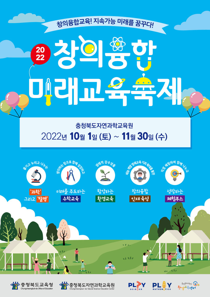 2022. 창의융합 미래교육축제는 과학, 수학, 환경, 영재, 발명 영역을 총망라해 학생과 학부모, 교사가 참여하는 행사로, 10월 1일(토) 다문화 어울림 영재교육 페스티벌을 시작으로 전시, 학술, 체험으로 46개의 프로그램으로 진행된다.