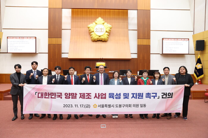 | ▲ '대한민국 양말 제조 사업 육성 및 지원 촉구 건의안'을 채택한 도봉구의원들이 기념촬영을 하고 있다.(사진=도봉구의회 제공) |