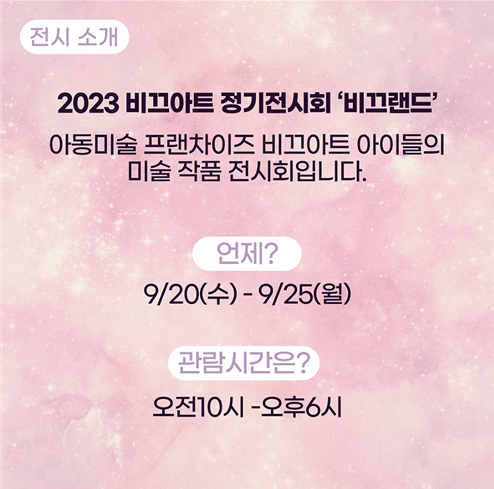 오는 9월 20일(수)부터 25일(월)까지 인사동 라메르 갤러리 1, 2, 3층 전관에서 진행되는 이번 정기전시회 ‘비끄랜드’에서는 전국 60개의 비끄아트 지점들에서 미술을 배우고 있는 원생 약 1천여 명의 학생들이 참여해 출품한 개인작 및 단체작 작품 5천여 점이 전시될 예정이다.