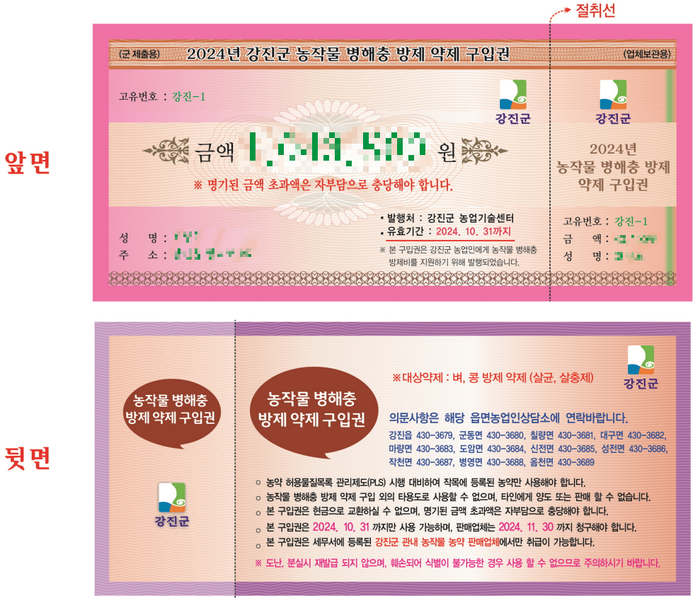 | ▲ 2024년도 강진군 병해충 방제 약제 구입권 앞뒷면 이미지 / 강진군 제공 |
