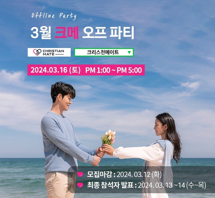 오는 16일 진행되는 봄맞이 3월 크메 오프파티는 깔끔한 인테리어의 크리스천메이트 강남 본사 라운지에서 진행되며 3월 16일 토요일 오후 1시부터 5시까지로 예정하고 있다.