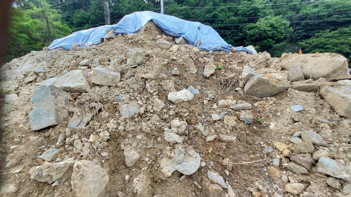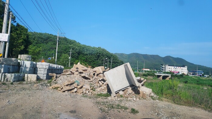 군에 따르면 이곳은 인근 공사 업체에서 보관하였고 하천변으로 흘러 내려간 폐기물 덩어리와 암석은 일부 걷어내어 처리 하였다고 했다.