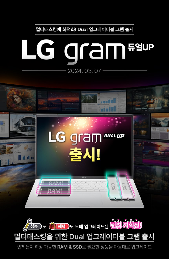 LG전자 공식 온라인 판매점 '이좋은세상'은 LG 그램17 듀얼UP 런칭 이벤트로 RAM과 SSD를 무상으로 업그레이드해 준다고 밝혔다. RAM 16GB + SSD 256GB와 RAM 32GB 중 선택할 수 있고 인텔 소프트웨어 패키지도 증정한다.