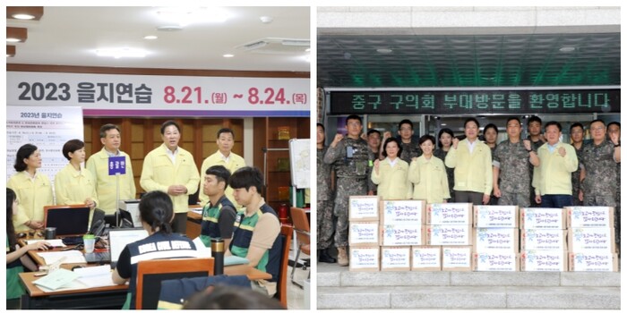 [시민일보 = 여영준 기자] 서울 중구의회 길기영 의장, 윤판오 부의장, 이정미 의회운영위원장, 송재천 행정보건위원장, 조미정 복지건설위원장이 을지훈련 기간인 지난 23일 중구청 을지훈련 상황실과 보병 제218여단 2대대를 방문해 훈련 참가자들을 격려했다.