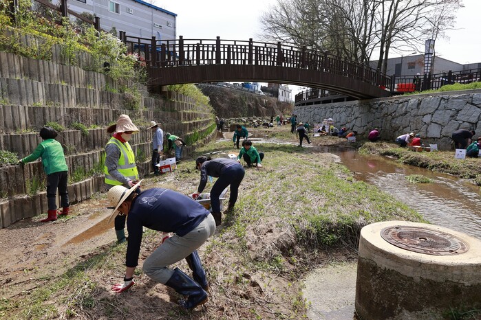 | ▲ 동윤촌 생태하천길에 탄소흡수원 꽃창포를 식재하는 모습. (사진=보성군청 제공) |