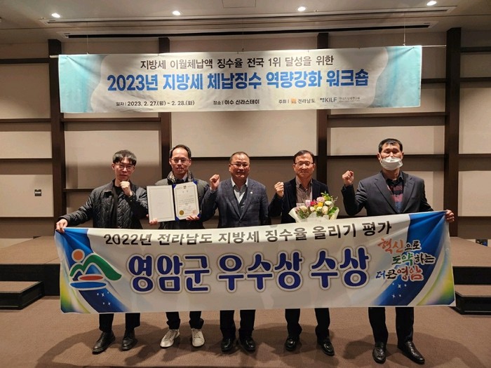 | ▲영암군 관계자들이 지난 27일 여수 신라스테이에서 열린 2023년 지방세 체납징수 역량강화 워크숍에서 전라남도 주관 2022년도 전라남도 지방세 징수율 올리기 평가 우수기관에 선정돼 상을 수상하고 기념촬영을 하고 있다. |