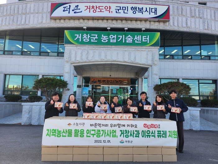 지원하는 ‘오늘자람 거창한 사과 사곽사곽 퓨레’는 거창 농민이 직접 재배하고 거창군 농산물가공지원센터의 HACCP 시설에서 가공했으며 사과의 껍질과 씨를 제거하고 첨가물 없이 통째로 갈아 만들기 때문에 영유아 이유식, 어르신 간식, 각종 요리 소스 등으로 활용할 수 있다.