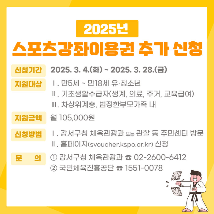 [시민일보 = 박소진 기자] 강서구(구청장 진교훈)는 저소득층 유·청소년의 체육활동을 돕기 위해 스포츠강좌 이용권 지원 대상자를 추가 모집한다고 밝혔다.
