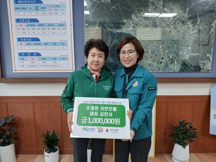 [합천=이영수 기자] 합천군 초계면 귀빈모텔(대표 김민서)은 3월 31일 초계면사무소(면장 박은숙)를 방문해 영남지역 산불피해 복구를 위한 특별모금 100만원을 기탁했다.