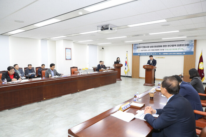 [시민일보 = 여영준 기자] 서울 금천구의회 의원연구단체인 ‘전통시장 활성화 연구회’가 최근 정재동 의원, 고성미 의원, 김용술 의원, 도병두 의원, 이인식 의원 등이 참석한 가운데 ‘금천구 전통시장 상권 활성화에 관한 연구 용역’에 대한 최종보고회를 개최했다.