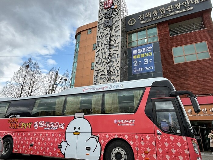 시티투어버스는 새로운 시 캐릭터 ‘토더기’와 브랜드 슬로건인 ‘돈 워리 김해피’를 모티브로 새롭게 디자인했다.