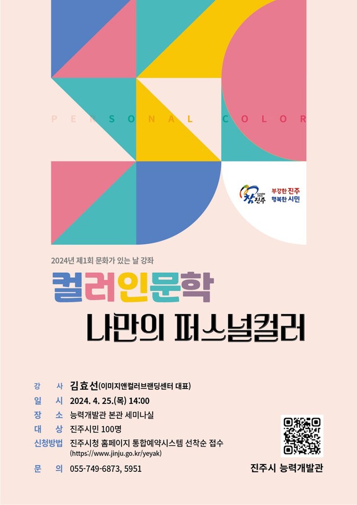 이번 강연은 ‘컬러 인문학, 나만의 퍼스널컬러’라는 주제로 퍼스널컬러와 이미지 브랜딩 전문가인 김효선 강사가 나와 참가자의 퍼스널컬러 진단과 컨설팅을 통해 이미지 경쟁력과 업무 전문성을 향상하는 방법을 알려줄 예정이다.