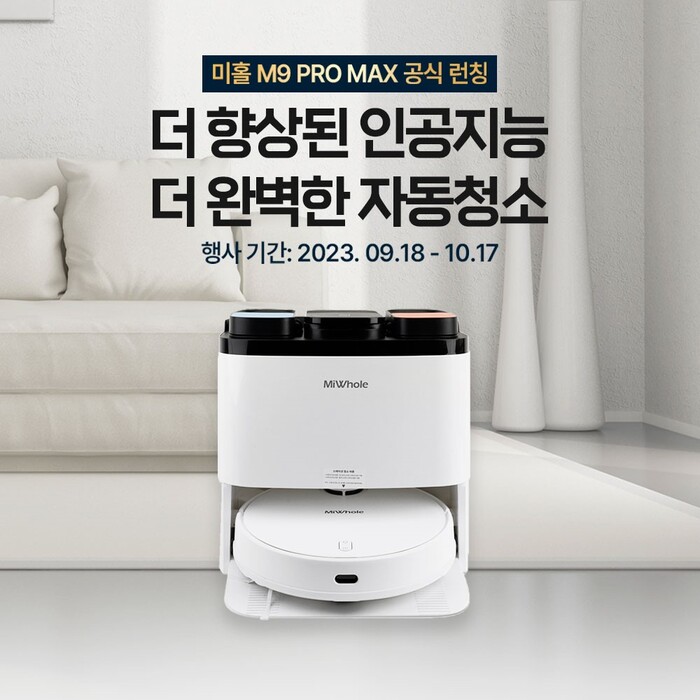행사 기간 내 ‘미홀 M9 PRO MAX’ 로봇청소기 구매 시 쓱싹 로봇청소기 살균청소제, 로봇청소기 경사로 2.8cm 세트, 미홀 워터저그 8L, 규조토 매트를 사은품으로 증정한다. 특히 포토리뷰 이벤트 참여 시 LG 톤플러스 HBS-PL6S, 카이카 에어건 핸디제트팬2, 미홀 스마트 휴지통, 미로 에어레스트 복합식 가습기, 쓱싹 세정클리너 풀패키지 중 1개를 추가 사은품으로 증정한다.