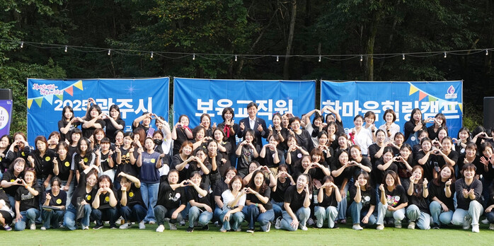 경기 광주시가 최근 곤지암 팀업캠퍼스 더포레스트 캠핑장에서 지역내 보육 교직원을 대상으로 치유캠프를 개최했다. 사진은 치유캠프에 참석한 방세환 시장이 보육 교직원들과 기념 촬영을 하는 모습. (사진=광주시청 제공)