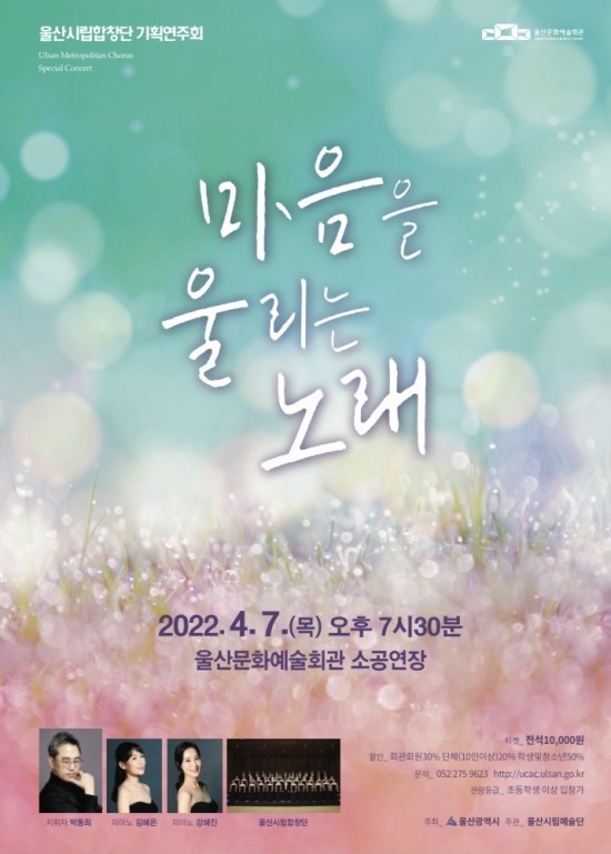 [울산=최성일 기자]울산시립합창단이 오는 4월 7일 목요일 오후 7시 30분 울산 문화 예술 회관 소 공연장에서 기획 연주 회 ‘마음을 울리는 노래’ 를 선보인다.