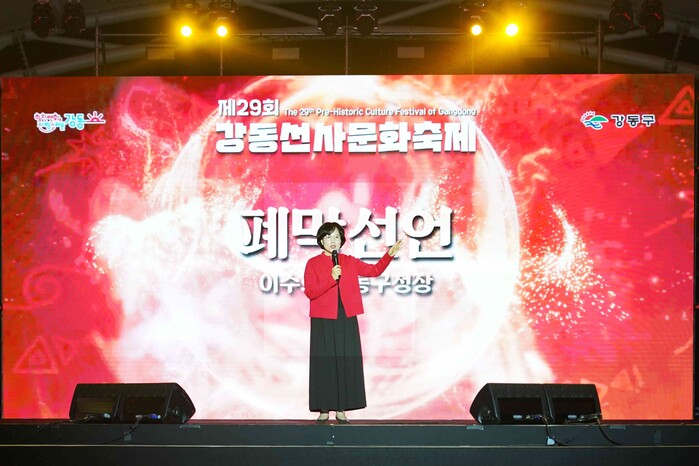 | ▲ 제29회 강동선사문화축제 폐막식에서 폐막선언 중인 이수희 강동구청장(사진=강동구청 제공) |